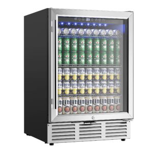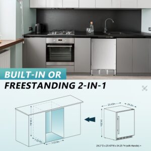 - Built-in or Freestanding Design:The under counter fridge has a unique front ventilation design that allows for air circulation without the need for extra space on the sides or back. The built-in feature of the beverage fridge with glass door will save a lot of space in your kitchen, especially suitable for installation in kitchens, cabinets, living rooms, garages and other places.Product size 22.6″D x 23.4″W x 34.3″H.